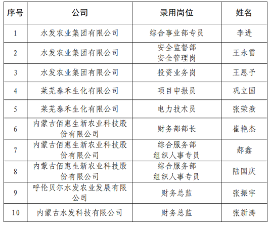 根据《水发集团有限公司社会招聘公告》及有关要求,经报名、资格审查、笔试、面试等程序及集团党委会研究,拟录用李进等10名人选(名单见附件),现予以公示。